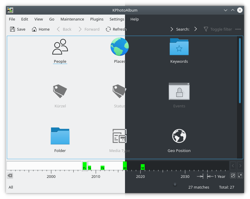 أضاف دعمًا لخطط الألوان المخصصة. لدى KPhotoAlbum الآن أيضًا "وضع مظلم". هناك خيارات تجريبية لضبط بحث الصور. وأضاف أيضًا أداة سطر أوامر kpa-thumbnailtool لإدارة خبيئة الصور المصغرة لـ KPA.
