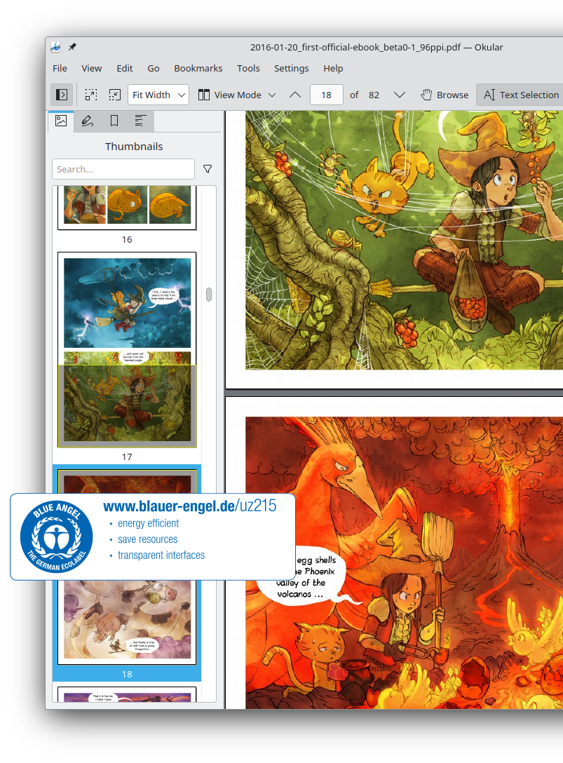In 2022, KDE's popular multi-platform PDF reader and universal document viewer Okular became the first ever Blue Angel eco-certified computer program! Blue Angel is the German version of the U.S. Energy Star label.
