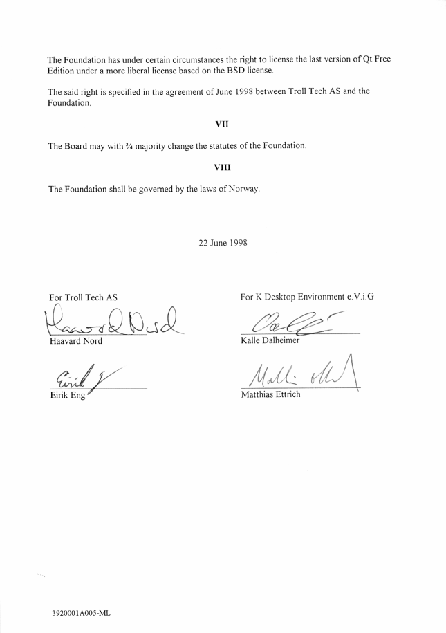 Below is a list of the pages of the document containing the original agreement between the KDE Free Qt Foundation and Trolltech from June 1998: